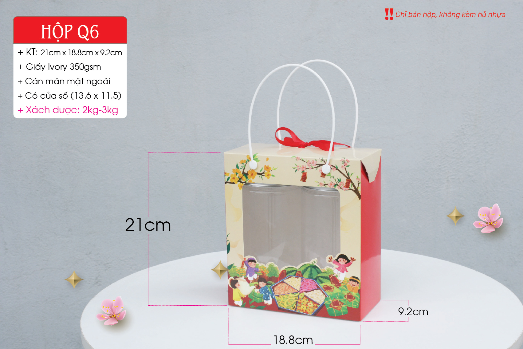 * Dùng đựng hộp thực phẩm, khô mực, khô heo, khô gà, hạt điều, đậu phộng; Đựng được 2 hủ nhựa nắp nhôm 1.200ml hoặc 2 hủ nhựa vuông 1kg, sản phẩm có kích thước phù hợp. Hộp đựng bánh mứt