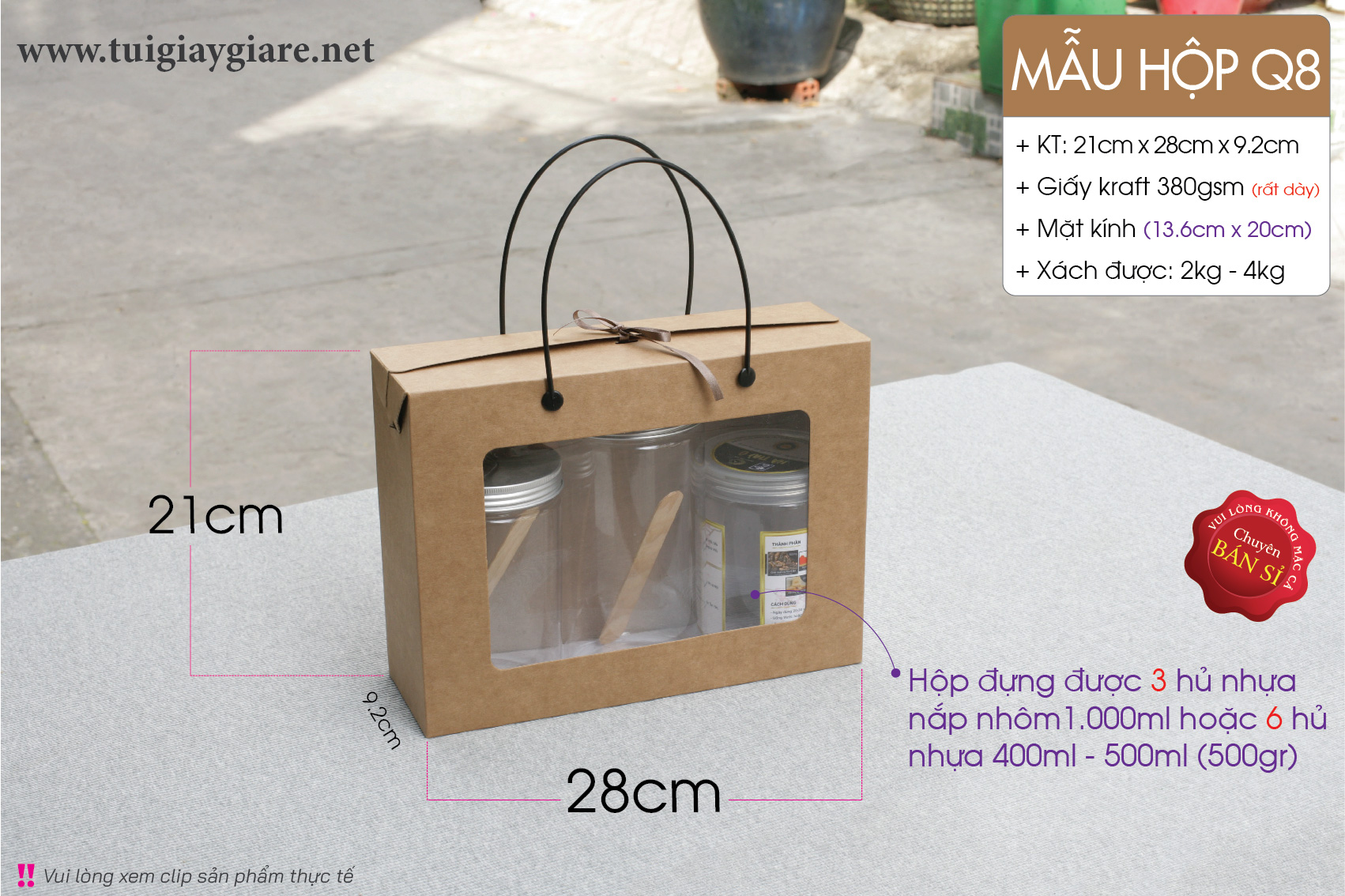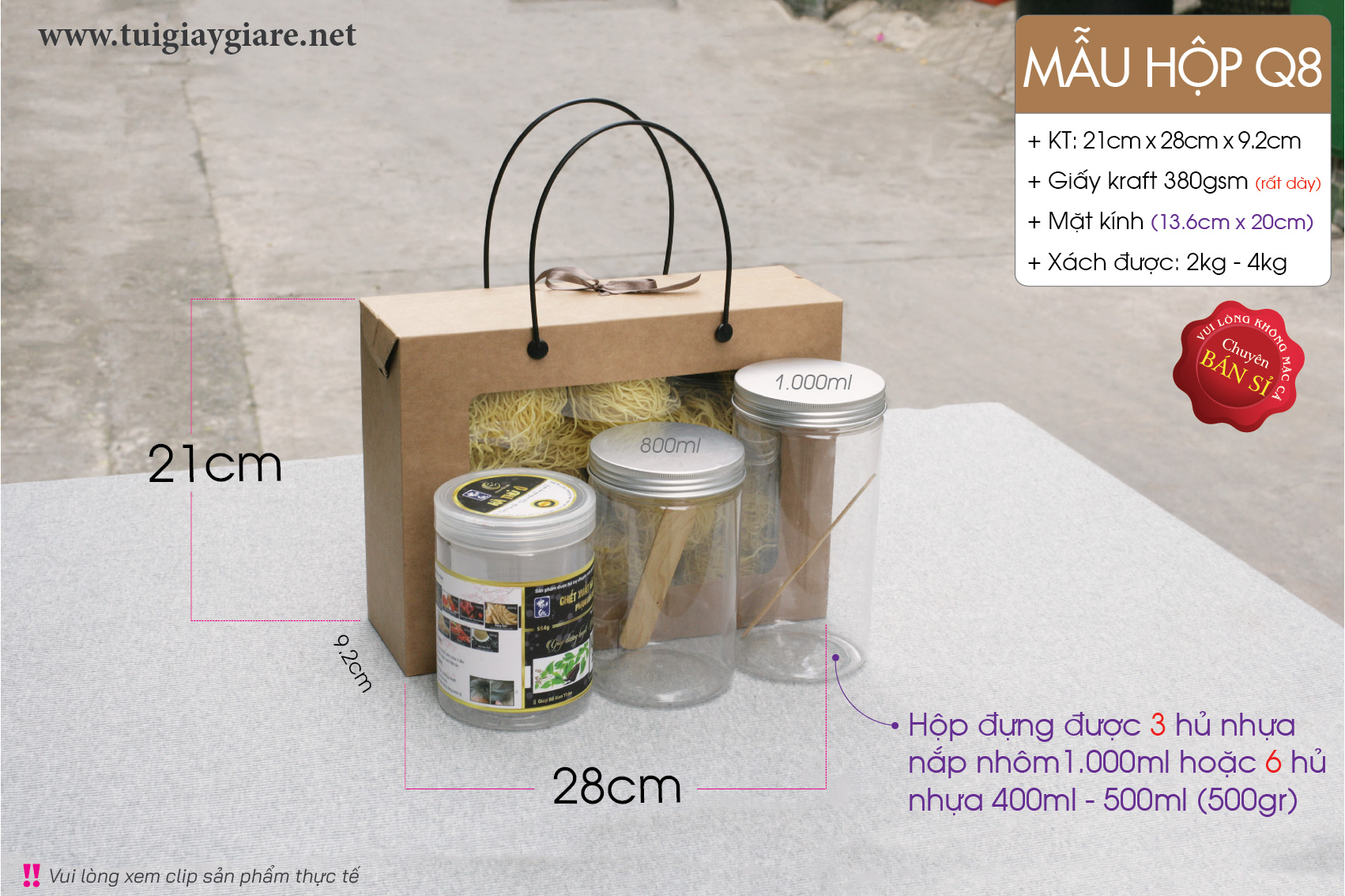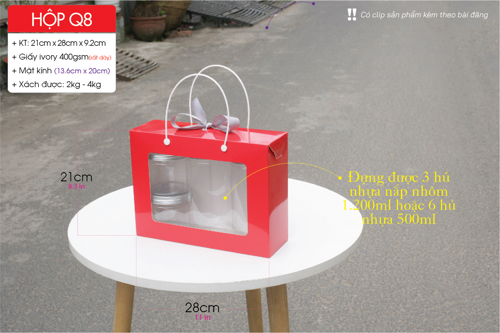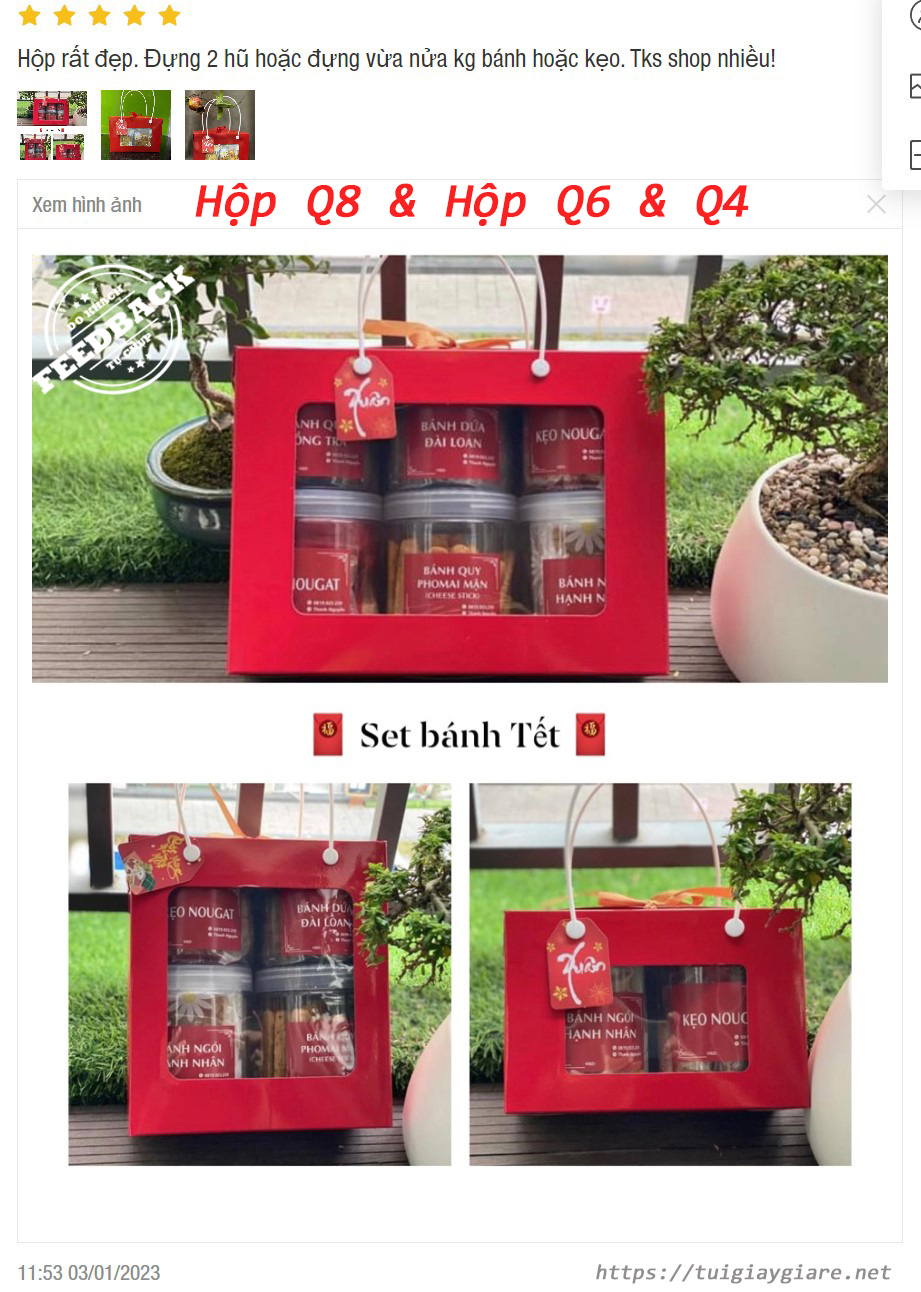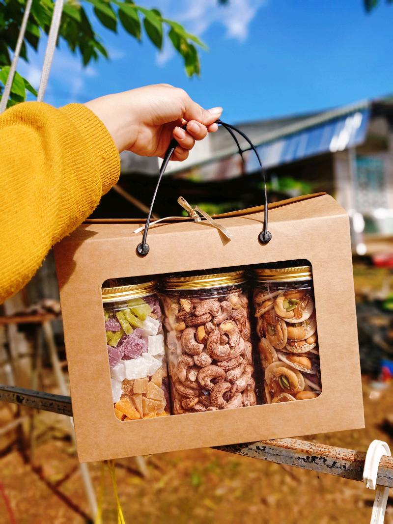 *** Hộp dùng đựng 1 set thức ăn vặt, Quà tết thực phẩm, Bánh mứt, khô mực, khô heo, khô gà, hạt điều, … Đựng được 3 hủ nhựa nắp nhôm 1,2 lít hoặc 6 hủ nhựa 500ml. Hộp thức ăn vặt