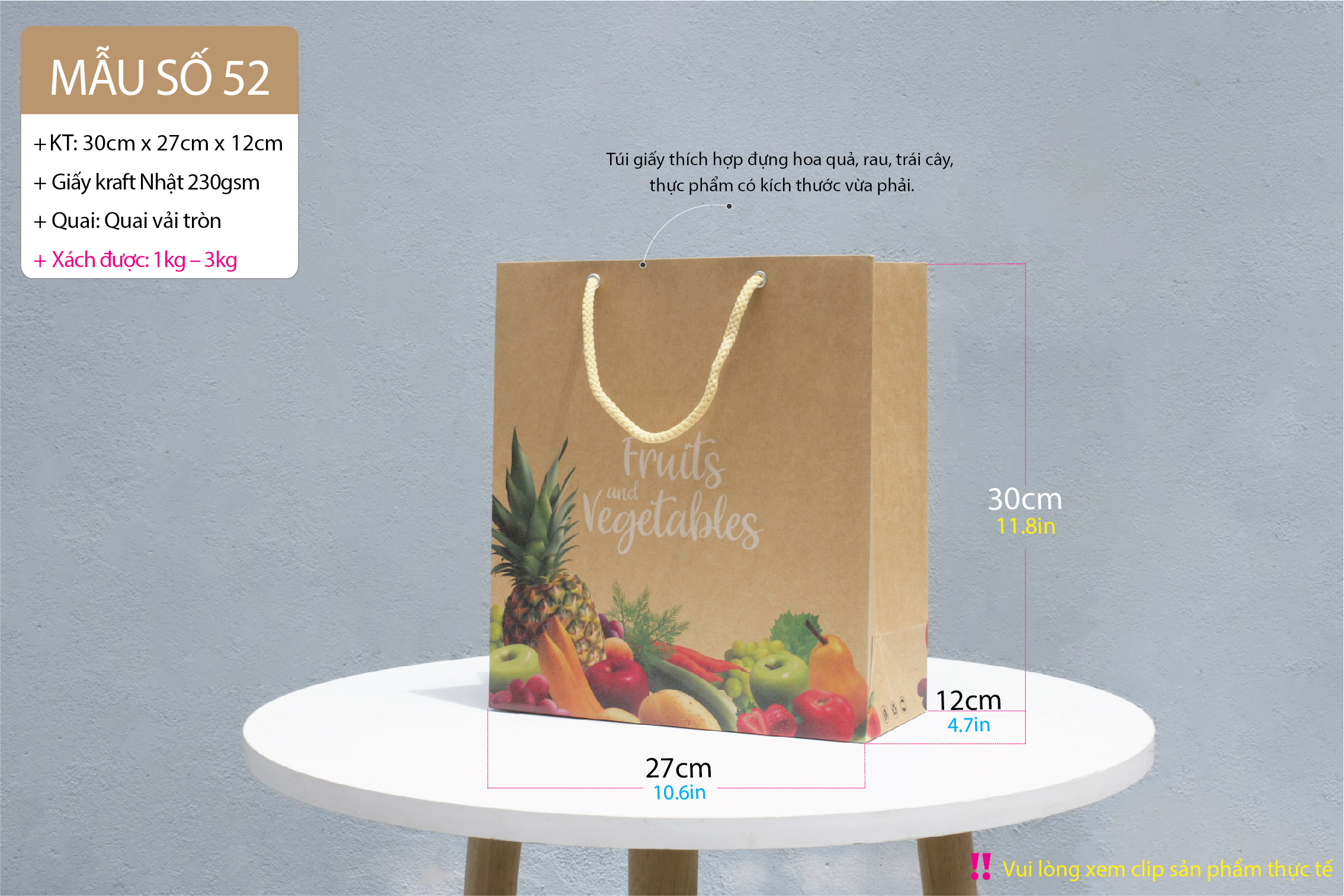 *** Lưu ý: Túi chịu được trọng lượng từ 1kg – 3kg nhưng Quý khách nên lưu ý kích thước từng loại trái cây với kích thước Túi giấy sao cho phù hợp. Ví dụ: Có thể bỏ được 2kg – 3kg quả Quýt, nho vào túi nhưng không thể bỏ 1 quả Sầu riêng 1,5kg vào túi giấy này được nhé !
