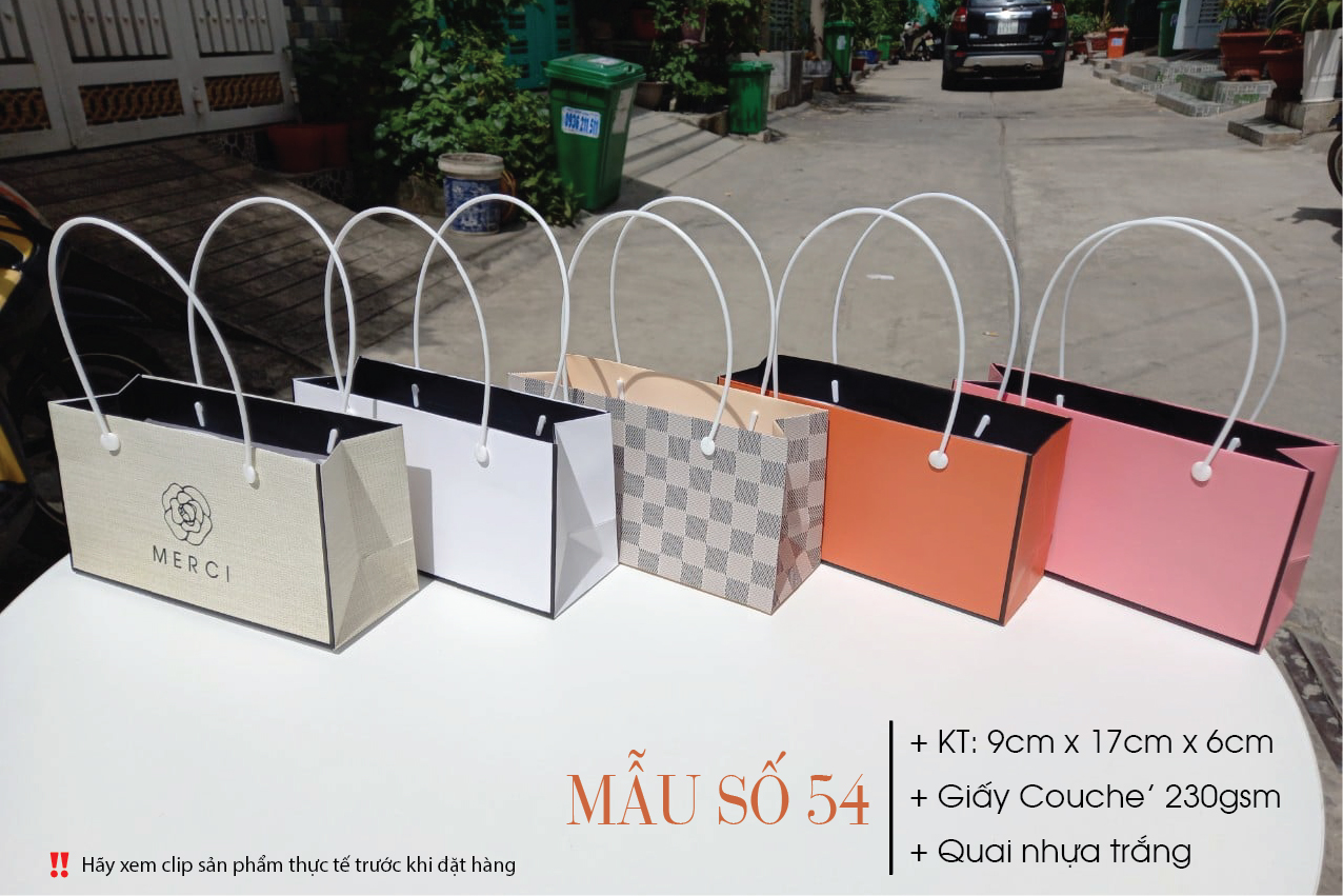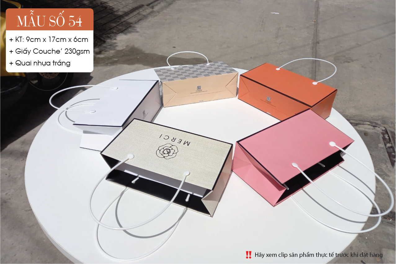 - Với 5 mẫu thiết kế cộng với quai nhựa tạo ra sự sáng tạo và mới lạ nhưng không kém phầm chắc chắn cho chiếc túi giấy.
