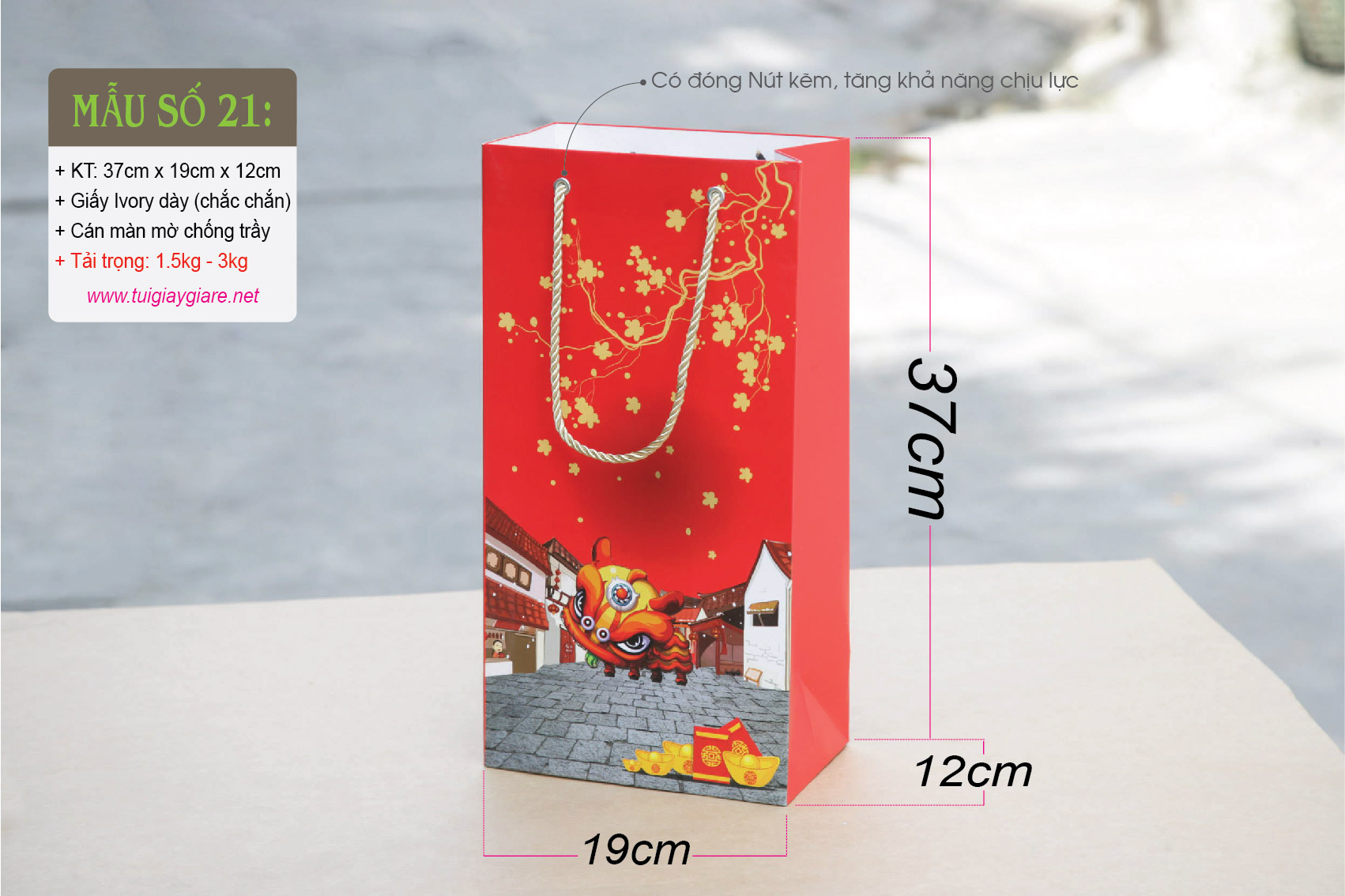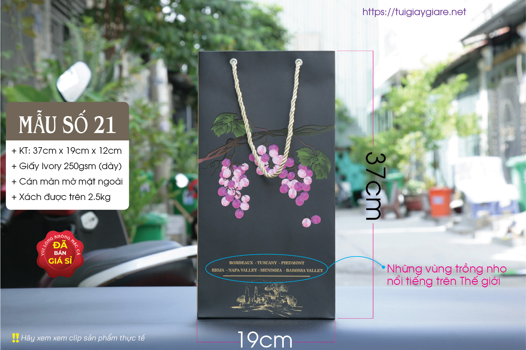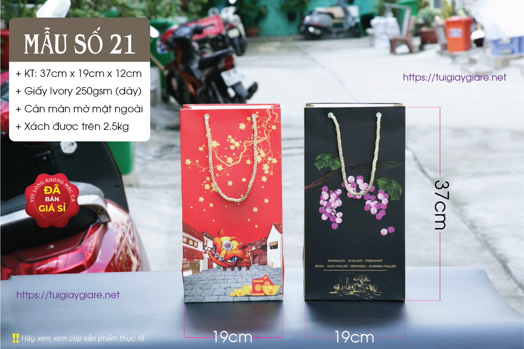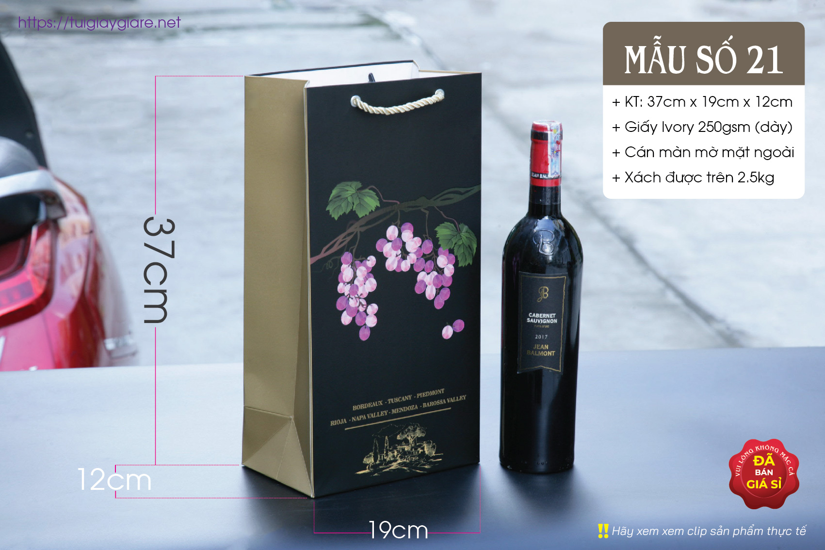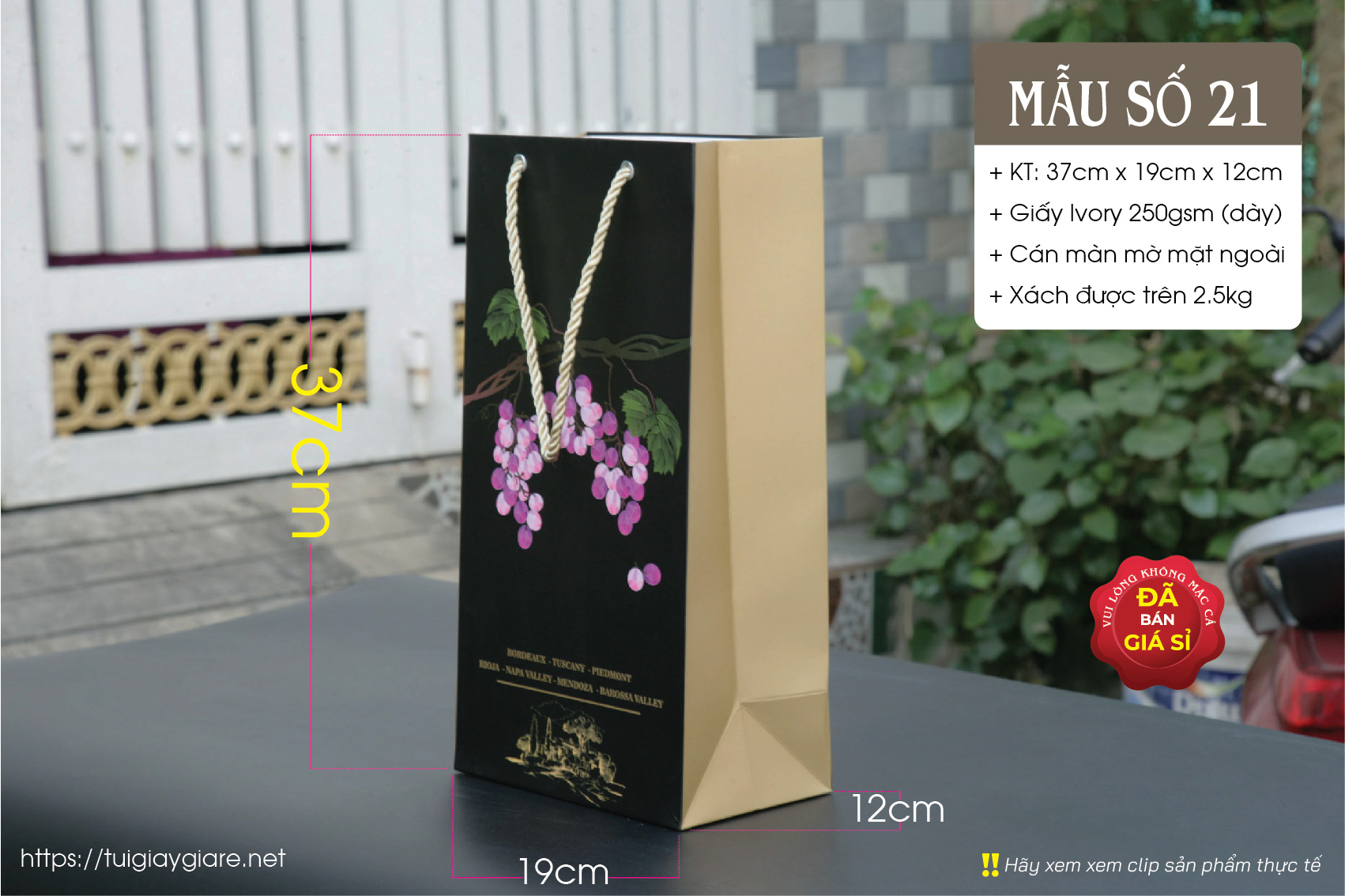 Túi giấy phù hợp đựng Rượu ngoại, nước trái cây, tặng phẩm sang trọng. Túi đựng được hầu hết các loại rượu ngoại như Chivas 18 có hộp (như hình chụp), Chivas 21, Gold Label (như hình chụp với chai 1 lít) có hộp, 2 chai rượu vang 750ml …