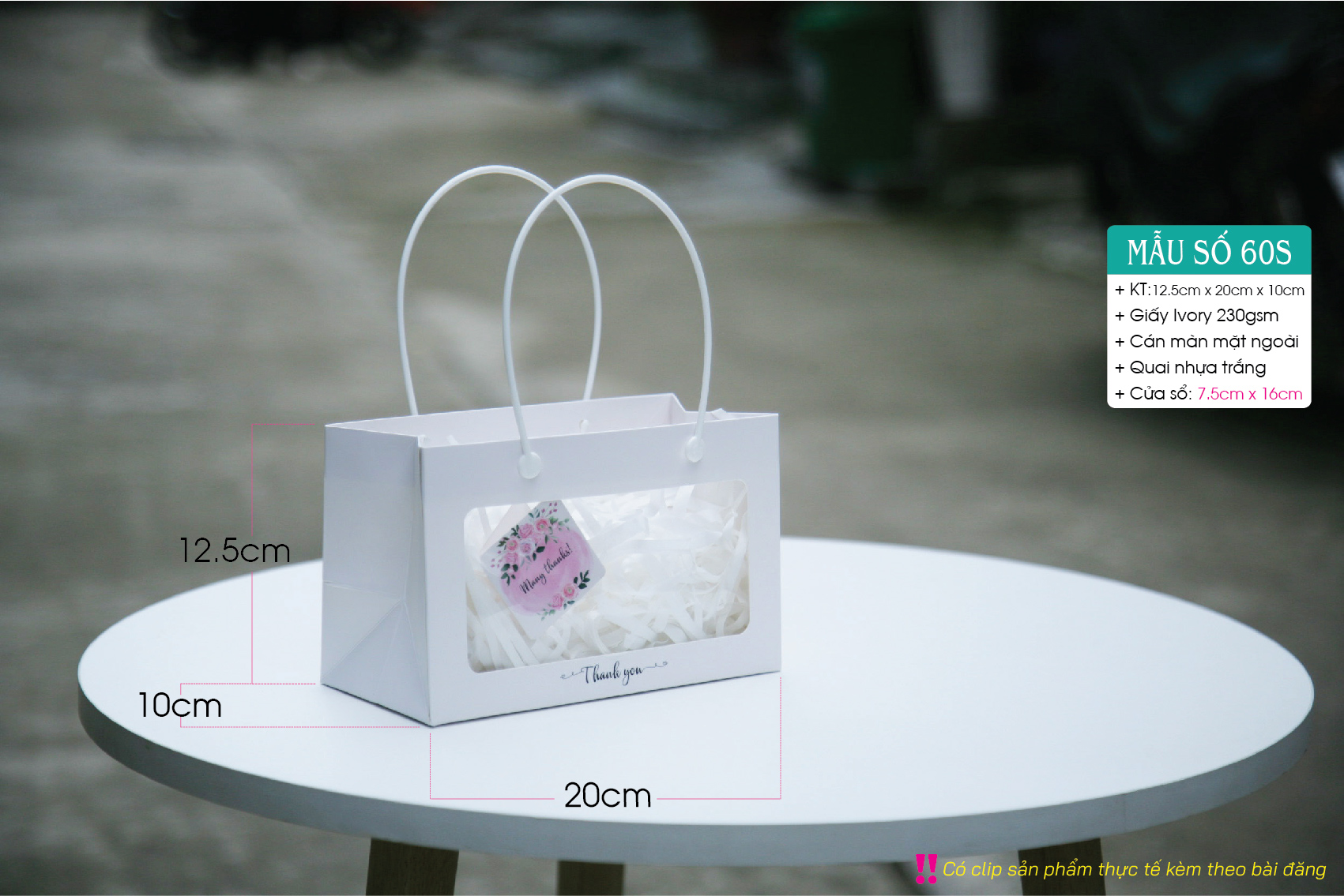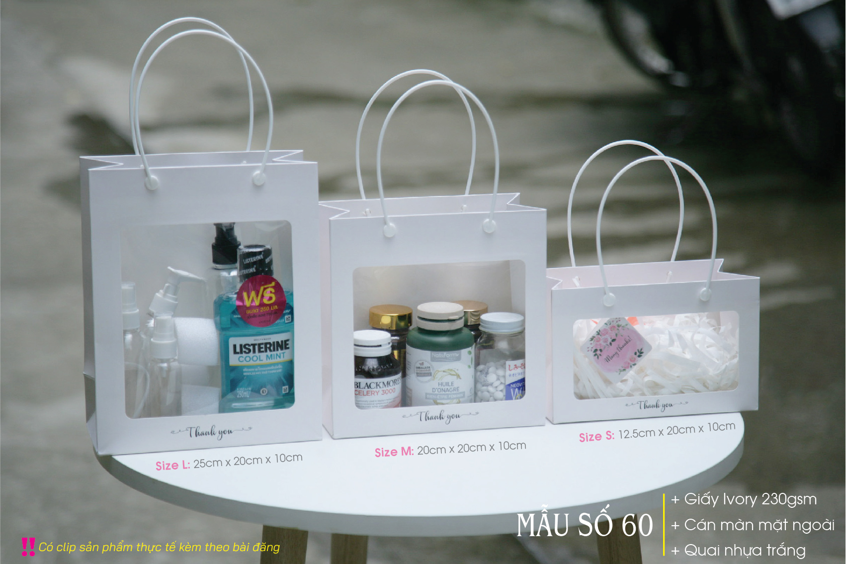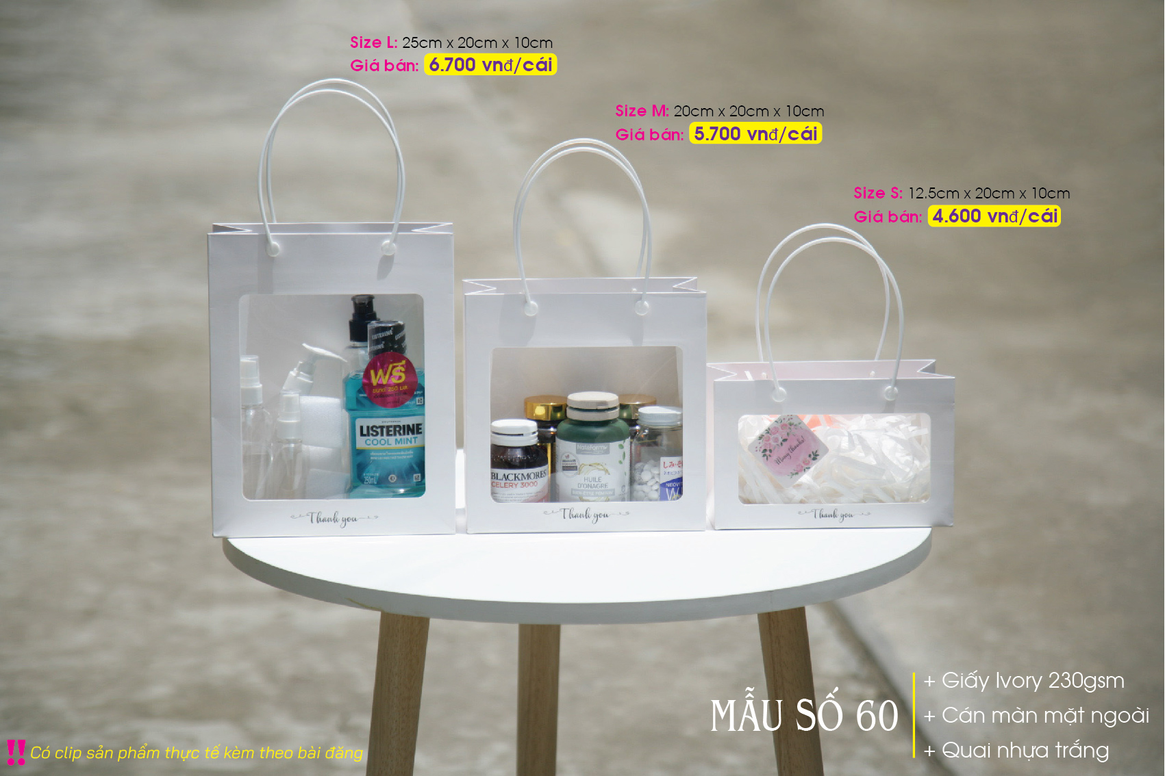 Túi mica trắng – Túi giấy có cửa sổ mica – Gồm 3 size S M L – Paper bag with clear window